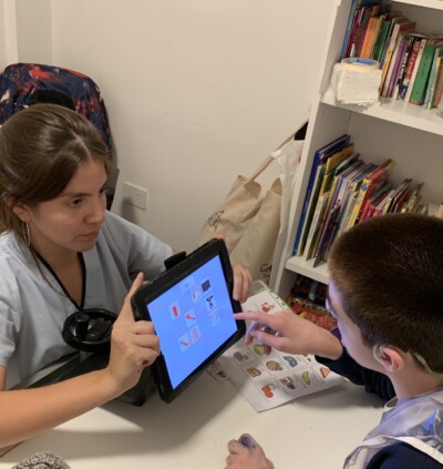Tecnología Asistiva y Comunicación Aumentativa Alternativa: tanto de baja como alta tecnología. Creemos importante que el niño se comunique con todos los recursos que pueda, a fin de cubrir una amplia gama de funciones comunicativas. Por tales motivos, cuando el habla no aparece en la edad adecuada, aplicamos recursos de comunicación aumentativa alternativa, mientras en paralelo se aborda específicamente el desarrollo del habla en todos los niños que tienen posibilidades motrices para hacerlo. Las mismas se realizan en conjunto con Terapia Ocupacional para evaluar en conjunto el punto de acceso más eficiente para la comunicación.