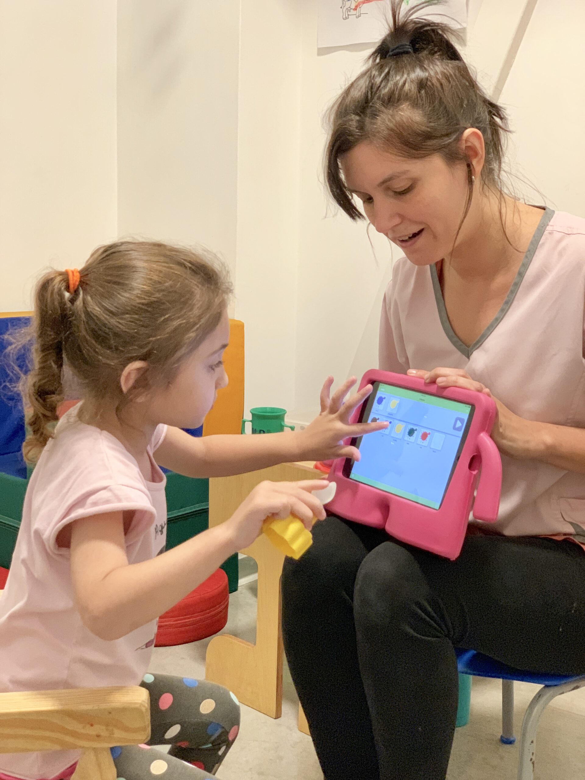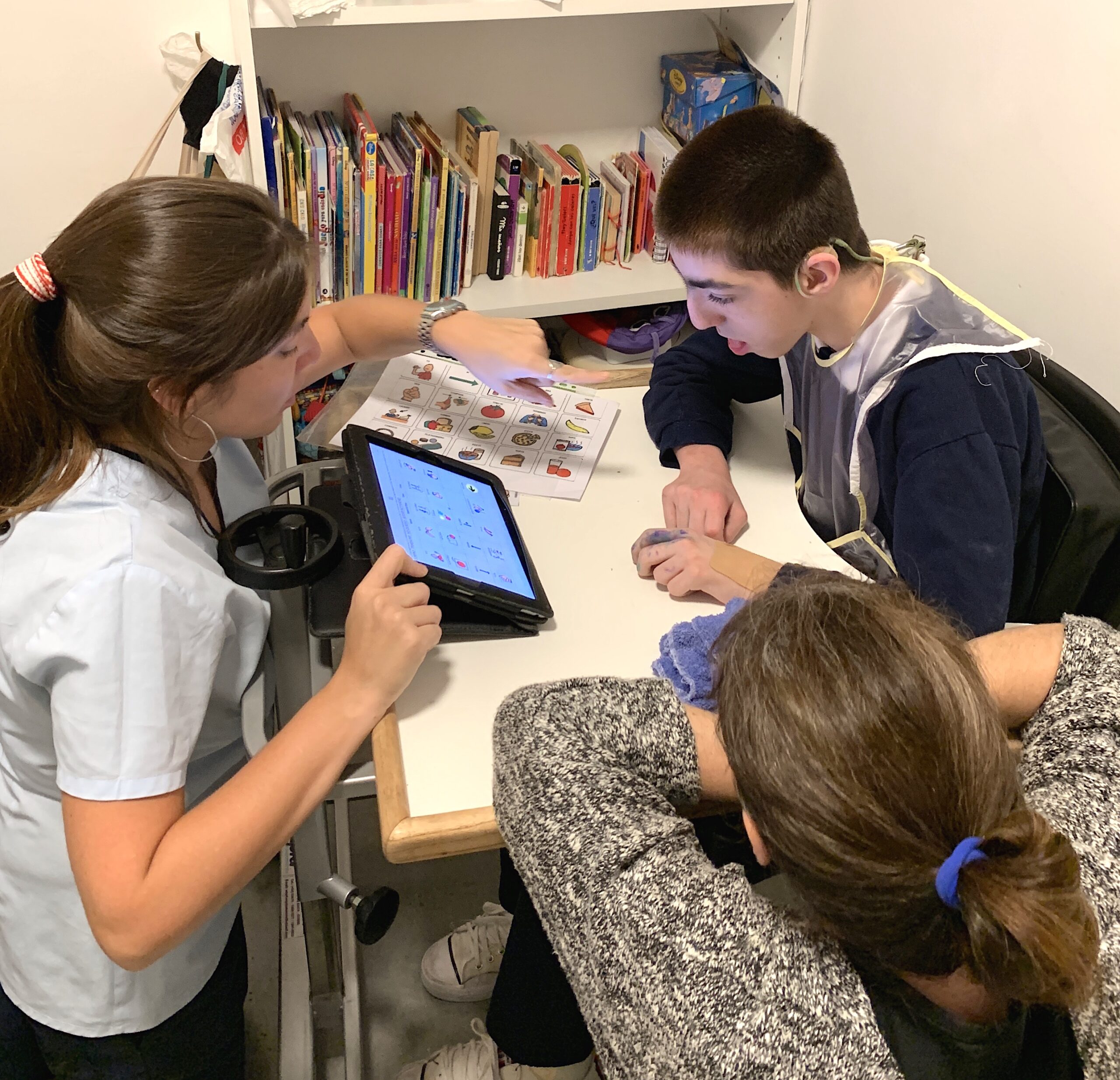 Tecnología Asistiva y Comunicación Aumentativa Alternativa: tanto de baja como alta tecnología. Creemos importante que el niño se comunique con todos los recursos que pueda, a fin de cubrir una amplia gama de funciones comunicativas. Por tales motivos, cuando el habla no aparece en la edad adecuada, aplicamos recursos de comunicación aumentativa alternativa, mientras en paralelo se aborda específicamente el desarrollo del habla en todos los niños que tienen posibilidades motrices para hacerlo. Las mismas se realizan en conjunto con Terapia Ocupacional para evaluar en conjunto el punto de acceso más eficiente para la comunicación.